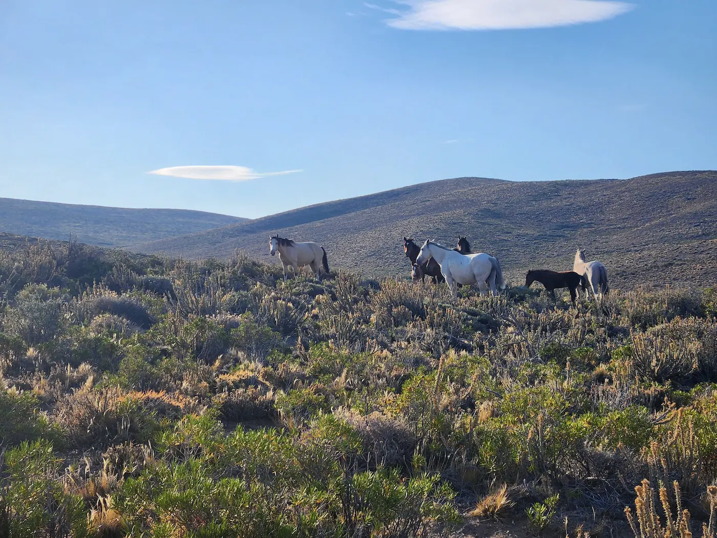 Grupo de caballos pastando en el campo en venta de 20.500 ha en Chubut, Patagonia.
