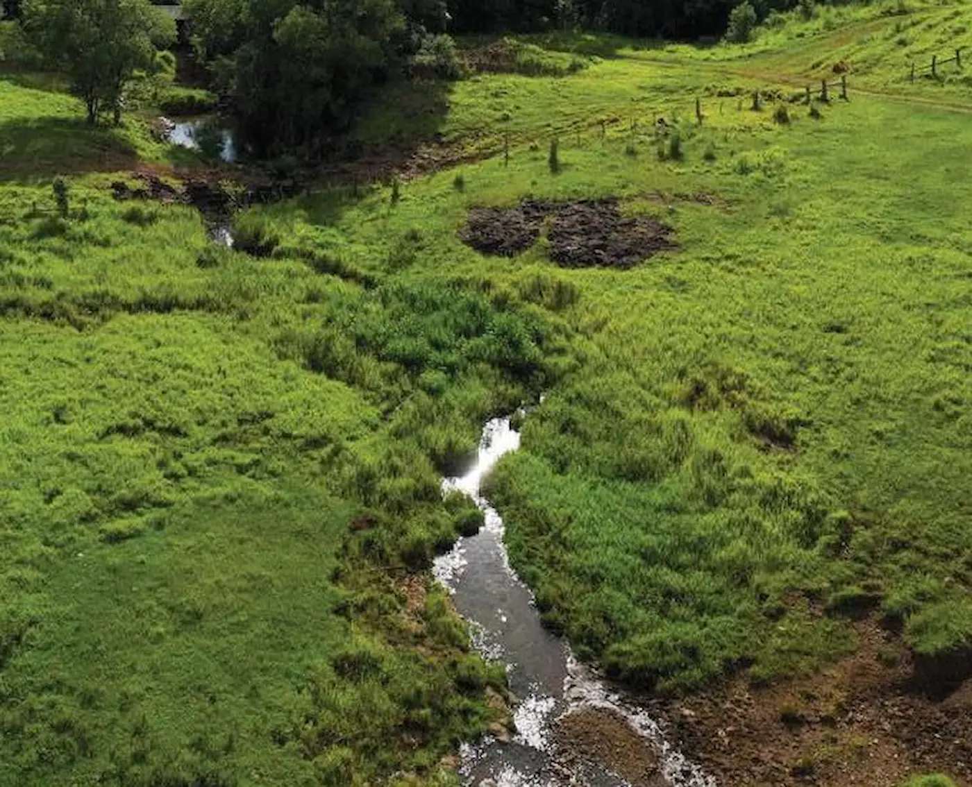 Arroyo cristalino rodeado de pastos verdes en campo de Misiones