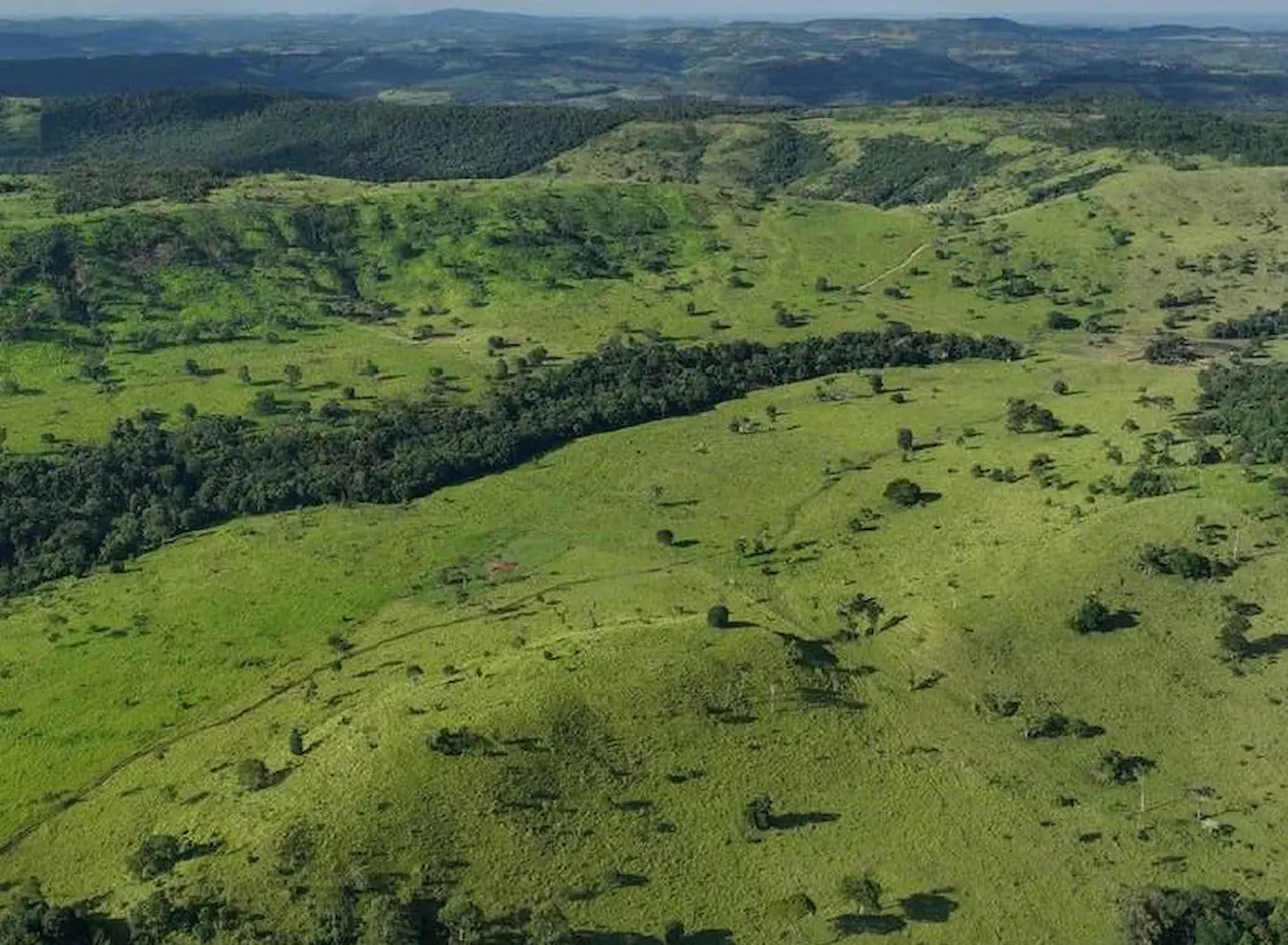 Panorámica aérea de campo productivo con ondulaciones y vegetación nativa en Misiones