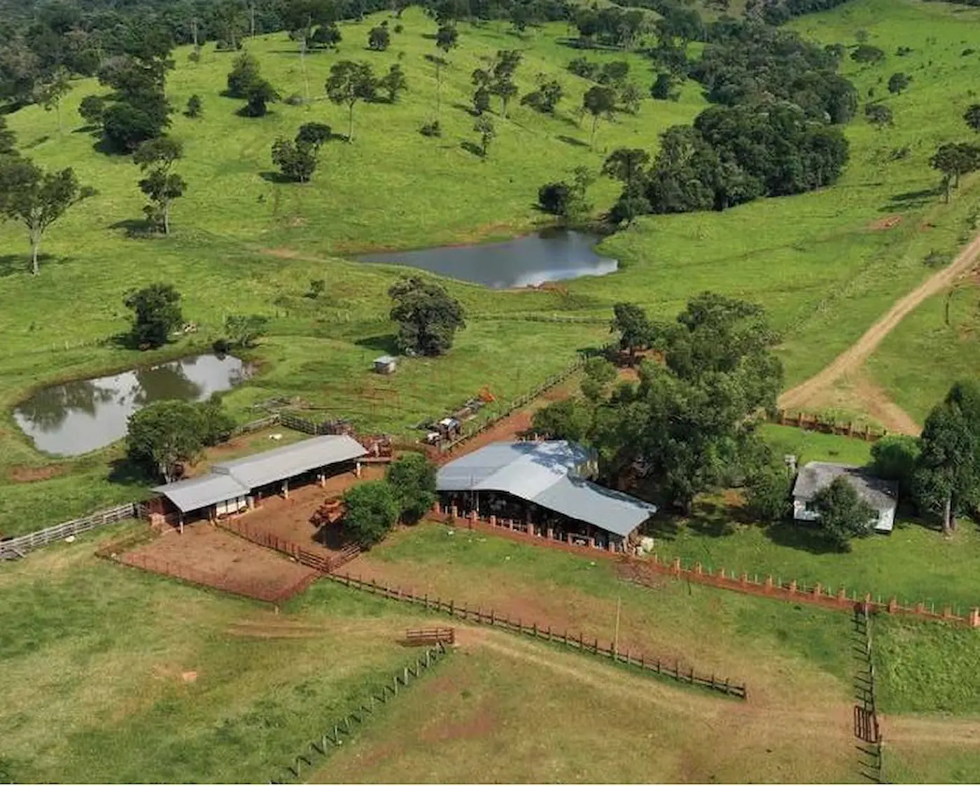 Infraestructura rural con galpones y lagunas en campo de Misiones visto desde el aire